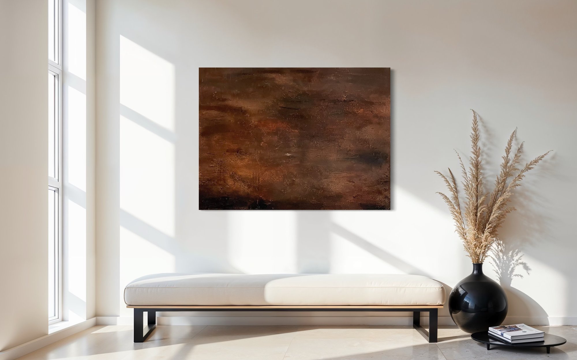 After the Fire - is a textured abstract painting that captures the haunting calm that follows chaos. Deep earthy tones of burnt umber, black, and raw sienna echo the resilience of nature after destruction. The layered texture resembles tree bark turned to ember—remnants of what once was, now transformed.